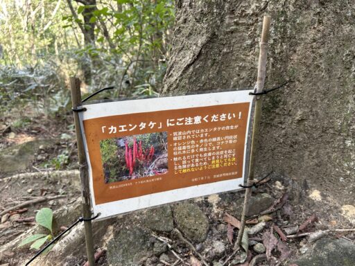 キャンプ場コースに「カエンタケ」の注意標識あり。
